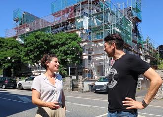 Fachsimpeln über die Sanierung des Komplexes Diezer Straße 56a/58: Angela Koppel von der Unteren Denkmalschutzbehörde und Eigentümer Alexander Maurer.