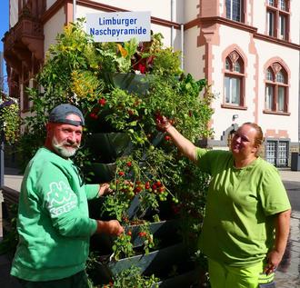 Thomas Foitzik und Melanie Merkel von der Limburger Stadtgärtnerei haben die sechs Naschpyramiden in der Limburger Innenstadt positioniert, die zu einem gesunden Imbiss einladen.