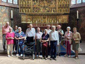 Das Foto zeigt die Teilnehmerinnen und Teilnehmer des Sommerausfluges vor dem gotischen Hochaltar im Frankfurter Dom. Darunter der emeritierte Stadtdekan von Frankfurt, Pfarrer Klaus Greef (mit Rollator) und die Vorsitzende des Katholischen Blindenwerkes Hessen, Ingeborg Desai (4. von links).