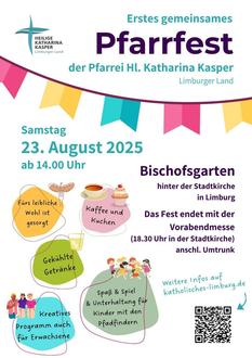 | 18.30 | Stadtkirche LM | Vorabendmesse in der Stadtkirche, als Abschluss des Pfarrfestes der Kirchorte im Bischofsgarten (DK G. Rehberg) |