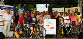 Eine Bühne voller Aktiven, die beim STADTRADELN über drei Wochen möglichst oft das Fahrrad als Verkehrsmittel oder auch als Freizeit- und Sportgerät nutzten. Die Preise verliehen der Erste Kreisbeigeordnete Jörg Sauer (links) und Limburgs 1. Stadtrat Michael Stanke (3. von rechts).
