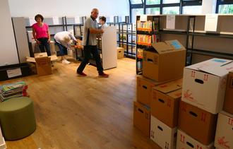 Das Ausräumen, Bücher, CDs, Videos und mehr rein in die Kisten, ging natürlich schneller als das systematische Einräumen. Am alten Standort in der Frankfurter Straße stapelten sich schnell die gefüllten Kisten, die in Reihe stehend auf den Abtransport warteten. Leere Regale zeugten schnell davon, dass schon vieles an Medien den Weg in die Umzugskisten gefunden hatte. Im hinteren Bereich wurde noch fleißig eingeräumt.