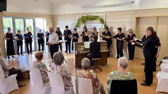 Mit reiner Intonation und natürlicher Sprachbehandlung wusste der Frauenchor Langenscheid, - seit 38 Jahren leitet ihn Frank Sittel - mit "Wach auf, mein's Herzens Schöne" im Satz des Chorleiters, dem Madrigal "Tanzen und Springen" von Hans Leo Hassler, "Viel Freuden mit sich bringet", einem Chorsatz von Paul Hindemith, dem altmeisterlichen "Im schönen Monat Maien" von Thomas Morley, sowie den beiden englischen Songs "Peace, perfect peace" von Christopher Tambling und "Here I am, Lord" von Malcolm Archer - am Klavier von Hildegard Storch begleitet - zu überzeugen.