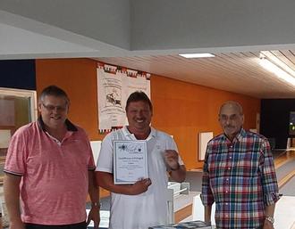 Hier wurde Matthias Schlögel für 40 Jahre im hessischen Kegler Verband sowie im Kegelsportverein Limburg mit Urkunde und der silbernen Ehrennadel geehrt.