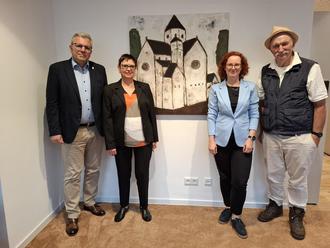 Im Kulturzentrum der Stadt Limburg ist das Werk „Synagoge Limburg“ des Künstlers Alexander Dettmar ab sofort zu sehen. Bürgermeister Dr. Marius Hahn, Stadträtin Birgit Geis und Amtsleiterin des Kulturamts Dr. Anna Vössing (von links nach rechts) freuen sich sehr, dass Alexander Dettmar (ganz rechts) mit seinem Werk ein Stück Erinnerungskultur nach Limburg zurückgebracht hat.
