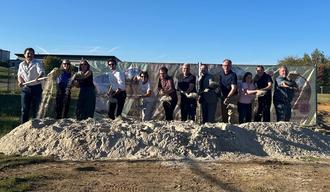 Gemeinsam erfolgte der erste Spatenstich für ein erfolgreiches Gelingen der Bauarbeiten: (im Bild von r.n.l.) Sascha Schermert (Ortsvorsteher Innenstadt), Nikita Gibin und Paula Beckers (Vorsitzende des Jugendparlaments), Michael Köberle (Landrat), Stefan Muth (Stadtverordnetenvorsteher), Dr. Marius Hahn (Bürgermeister), Christian Spiegelberg (Leiter des Amtes für Familie, Soziales und Integration), Bärbel Stillger (Stadtentwicklungsamt), Janis Korell (Rittmannsperger Architekten), Ina Reinecke und Maike Holling (MS PLUS Architekten), Marc Lukowski (LS2 Landschaftsarchitekten).