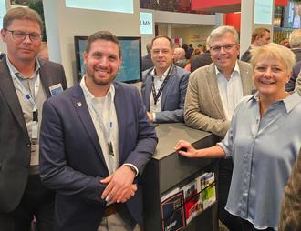 Warben auf der Expo Real 2023 in München für den Standort Limburg und den Landkreis Limburg-Weilburg (v.l.): Lars Wittmark (WFG), Andreas Hasenstab (Stadt Limburg), Pedro Paredes Cuadrado (WFG), Bürgermeister Dr. Marius Hahn und Eva Struhalla. Foto: Stadt Limburg