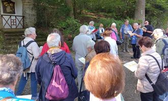 Ein Höhepunkt der Wallfahrt war der gemeinsame Kreuzweg, der auf dem Klostergelände gegangen wurde. Er wurde vorbereitet und geleitet von der geistlichen Begleiterin des KAB-Bezirksverbandes Limburg, Karin Seck. Sie verstand es ausgezeichet, einen "Kreuzweg der Solidarität" nah erfahrbar zu machen und zu Verstehen zu geben, dass der Kreuzweg Jesu nicht nur vor 2000 Jahren stattfand, sondern sich Hier und Heute, jeden Tag und überall auf der Welt ereignet. "Jesus ganz unten. Das kennt unsere Gesellschaft gut: Oben ist oben. Unten bleibt unten. Du bist auf deine Rolle festgenagelt. Davon kommst du nicht mehr los. Senkrechtstarter sind selten. Du bleibst im Schlamassel stecken. Einmal unten, immer unten. Du kannst machen, was du willst. Du kannst dich abstrampeln: Du sitzt für immer fest. Jesus, du hast dich auf diesen Weg für die Menschen festnageln lassen.", so die Botschaft des Kreuzweges.