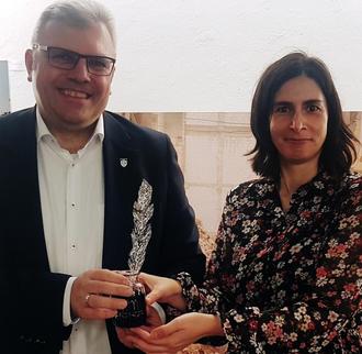 Sara Jäger ist die Preisträgerin des Hans-im-Glück-Preises 2022 und erhielt das damit verbunde Tintenfass mit Schreibfeder aus Glas durch Bürgermeister Dr. Marius Hahn.