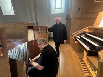 Orgelbauer Michael Müller (Osterspai am Rhein) und Frank Sittel, Organist in der Limburger Pallottinerkirche, während der Durchsicht und Überprüfung der schönen Instrumente in der Klosterkirche (Wiesbadener Straße 1).