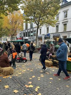 Zur rechten Seite des Neumarktes bastelten begeisterte Kinder Gespenster, schnitzten Kürbisse und versuchten sich im Kürbisangeln, organisiert vom Hof Heckelmann. Entlang der Bäume in Richtung Kornmarkt reihten sich beidseitig Stände mit Honig, Käse, Crêpes und Waffeln sowie Wildwurst aneinander – letztere war bereits kurz nach der Mittagszeit ausverkauft. Zwischen den Ständen und an den Schafen vorbei traten künftige Jungbäuerinnen und Jungbauern in die Pedale und sausten auf ihren kleinen Traktoren über den Neumarkt.