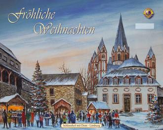 Die Adventskalender 2025 zieren winterliche Motive, die der heimische Künstler Wolfgang Kissel aus Heckholzhausen zur Verfügung gestellt hat. Wahlweise sind Ansichten vom Schlosshof mit Dom in Limburg, Backessteg in Elz, Schlosshof in Hadamar und dem Diezer Schloss erhältlich.