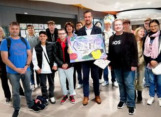 Die Schülerinnen und Schüler der Goetheschule mit den begleitenden Lehrkräften Herr Erik Feierfeil, Frau Veronique Gomez-Schneider und Herr Michael Kübler (v.l.) sowie dem französischen Schulleiter der französischen Partnerschule in Briord (Mitte) beim Überreichen des Gastgeschenkes.