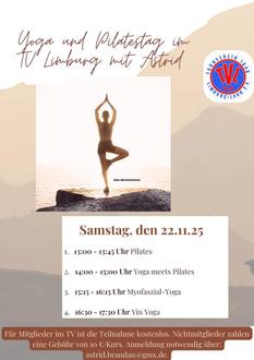 Am Samstag, dem 22.11.2025, von 13:00 Uhr bis 17:30 Uhr, bietet der Turnverein Limburg wieder einen Yoga- und Pilatestag für Jedermann an.