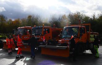 Die Einsatzfähigkeit der Straßenräumfahrzeuge wird geprüft und die Mitarbeiter gehen die Arbeitsabläufe durch.