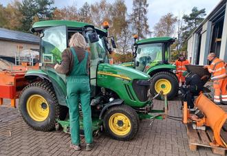Salzstreuer und Schneepflüge werden montiert und können im Winter die Radwege und Fußwege in der Stadt räumen.