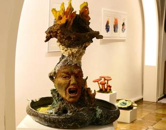 „Muktinath“ nennt Peter Vater seine Skulptur im Vordergrund, die er in der Ausstellung zeigt. Im Hintergrund die Feuer- und Wasser-Pilze von Thomas Müller.