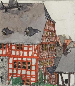Eine Radierung von Klaus Panzner des Römer 2-4-6 aquarelliert auf Maschinenbütten.