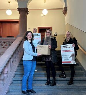 Im Rathaus der Stadt Limburg erfolgt die Übergabe der bisher eingegangenen Unterschriften des Bürgerbegehrens. Übergeben wurden diese in einem Karton von den Initiatoren des Bürgerbegehrens (von rechts nach links) Tanya Müller, Melanie Leonhardt und Philip Hirt an Silke Derichs, Büroleitende Beamtin der Stadt Limburg.