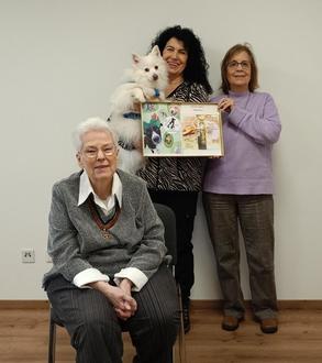 Spendenübergabe: sitzend Fr. Gabriele Moschek; v.li. Kerstin Napiontek mit Hund Justus vom Tierheim Staffel; Gabriele Sauer, Vors. Hospizdienste Limburg e.V.