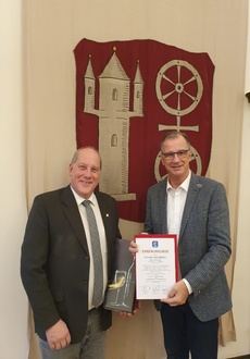 Im Rahmen einer Bürgermeister-Gesprächsrunde überreichte Bürgermeister Winfried Steinmacher, als Sprecher der Kreisgruppe Rheingau-Taunus des Hessischen Städte- und Gemeindebund, dem Bürgermeister Volker Diefenbach zu seinem 10-jährigen Jubiläum die Ehrenurkunde des HSGB und Innenministeriums. Auf diesem Wege gratulieren wir.
