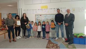 v.l. Tanja Reichert, KiTa Leitung, Bianca Heinrichs, KiTa Team, Lisa-Marie Zeithammer, Elternbeirat, die „Maxis“, Andreas Hahn, Elternvertreter, Bürgermeister Volker Diefenbach
