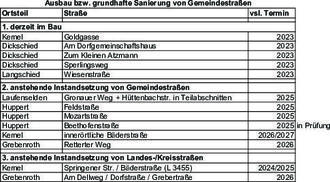 Nach diesem Vorgehen sind in den nächsten 3 Jahren, die in nachfolgender Liste aufgeführten Straßen in Planung. Die Liste wird jährlich von der Gemeindevertretung mit dem Haushaltsplan beschlossen und ist dort (siehe Homepage) auch einsehbar.