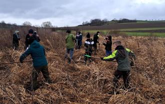 Der diesjährige Einsatz forderte von allen Beteiligten vieles ab. Schnee und Sturm durchnässte von oben, der unachtsame Tritt ins kalte Nass von unten. Trotzdem (oder gerade deshalb?) wurde die gemeinsame Arbeit mit Kettensäge, Freischneider, Astschere und Rechen für die Natur zum Erlebnis. Die Schüler rechten das Altgras zusammen, um die Sonne, wenn sie dann mal wieder scheinen würde, an den Boden zu lassen, die Jungjäger kümmerten sich um das „auf den Stock setzen“ der rasant wachsenden Weiden in der Fläche und am Ufer des Dörsbaches, um die Offenlandschaft nicht verbuschen zu lassen.