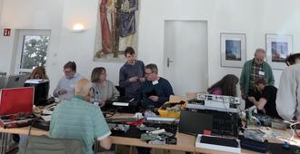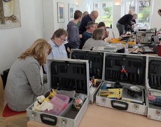 Helle Räume, die den Reparateuren und der Näherin die Arbeit erleichtern, ausreichend Platz für den Reparatur- und Café Betrieb, beide Bereiche getrennt und dennoch eng beisammen, mit Küche, die sehr gut und durchdacht ausgestattet ist. Der direkt angrenzende Parkplatz mit ebenerdigem Eingang ist sowohl für Besucher mit ihren Geräten als auch für die Reparateure mit ihrem Equipment eine echte Erleichterung. Anders als stationäre Repaircafés müssen wir ja alle Werkzeuge transportieren.