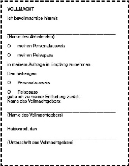 Sollte es Ihnen nicht möglich sein, den Personalausweis oder Reisepass selbst abzuholen, stellen Sie dem Abholenden bitte untenstehende Vollmacht aus.