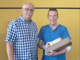 Der Vorsitzende des DRK Heidenrod Harald Schmelzeisen (selbst mit der 70. Spende) überreichte Gabriele Lang-Engelhardt für die 90. Spende ein Weinpräsent, ebenso Bernd Rößel für die 80. Spende.