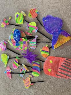 Neonfarbene Objekte leuchten im Schwarzlicht, aufgeregte Kinder hinter der Bühne - so ist das, wenn acht Kinder im Alter von fünf bis 9 Jahren eine Schwarzlichtaufführung proben. Gehemnisvolles Flüstern, manchmal auch noch sehr laut, Mitsingen der bekannten Melodien - all das wird noch geübt werden in den nächsten Wochen. Die Aufführung ist geplant für November 2025.
