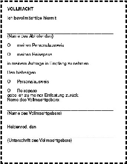 Sollte es Ihnen nicht möglich sein, den Personalausweis oder Reisepass selbst abzuholen, stellen Sie dem Abholenden bitte untenstehende Vollmacht aus.
