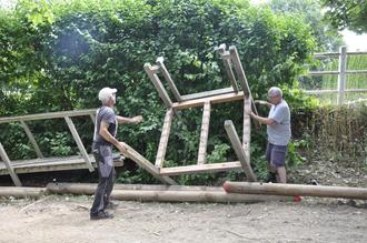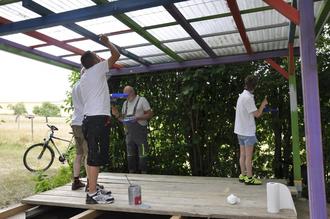Die Mitarbeiter/innen hätte uns ebenso gerne geholfen. Leider konnten sie aufgrund personeller Engpässe an diesem festgelegten Tag nicht abkömmlich sein. Wir konnten am Freitag, den 14. Juli den künstlichen, versickerten Bachlauf in ein neues Beet verwandeln. Der alte Sandkasten wurde mit einem neuen Anstrich versehen und ist nun auf dem Weg, ein überdachter Außenwohnsitz zu werden. Ein verwittertes Klettergerüst konnte zerlegt werden und wartet nun auf die Wiederbelebung zu einem unterfahrbaren Hochbeet. Nach sieben anstrengenden Stunden klang der Tag mit einem gemütlichen, leckeren Grillpicknick für Bewohner/innen, Mitarbeiterinnen und Helfer aus.