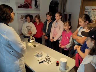 Am 27. Juni und 3. Juli besuchten insgesamt 61 Schülerinnen und Schüler der Grundschulen Laufenselden und Kemel die Kastell-Apotheke in Laufenselden. Nach einer kurzen Begrüßung durch den Apothekeninhaber Herrn Dr. Sebastian Barzen bildeten die Viertklässler drei Gruppen, um sich nacheinander drei spannende Stationen anschauten, die das Apotheken-Team vorbereitet hatte: zunächst wurden im Apotheken-Labor von Frau Katrin Schwappach einige chemische Experimente durchgeführt, bei denen die Schüler aus sicherer Entfernung, und mit Schutzbrillen ausgestattet, zuschauen und staunen konnten. In der nächsten Station konnten Sie unter Aufsicht von Frau Katja Werner Salben rühren, durften Kapseln befüllen und sich eine Brennnessel mitsamt ihren Brennhaaren unter dem Mikroskop anschauen.