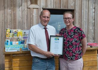ESCHENAUER - Bürgermeister Volker Diefenbach und Gisela Stang mit der Wiederauszeichnungsurkunde