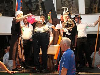 Der Abend in der gewohnt voll besetzten Bornbachhalle stand unter spannender Erwartung der Neubürgertaufe mit Dörsbachwasser. Wer seit mindestens zwei Jahren in Laufenselden wohnt, am Vereins- und Gemeinleben teilnimmt und mitwirkt, kann den ehrenvollen Status eines Laafesellers erhalten. Aufgrund der im Jahr 2020 wegen der Corona-Pandemie ausgefallenen Feierlichkeiten zur Fahlerkerb, wurde diese Frist ausnahmsweise verlängert.