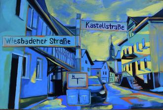 Seit 2019 hat die Künstlerin ihren Wohnsitz und ihr Atelier unter dem Uhrenturm der evangelischen Kirche in Laufenselden eingerichtet. Von dort aus beobachtet sie aus der Perspektive ihres Pinsels das ruhige Tempo des deutschen Landlebens. Ihre morgendlichen Spaziergänge, um Brötchen zu kaufen, die Entdeckung von Kühen auf der Weide, der goldene Farbton eines Heuballens und der letzte Hauch von Abendlicht auf der Seite eines Fachwerkhauses, all das fließt in Carolines aktuelle Kunstwerke ein. Was für einen Einheimischen alltäglich und nicht außergewöhnlich erscheinen mag, ist für Caroline eine Fundgrube an Inspiration und neuen kulturellen Erfahrungen.