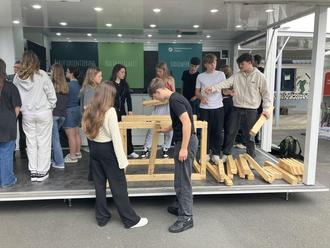 Zum Tag der Studien- und Berufsorientierung am 06.09.2024 besuchte der Handwerkskammer-Bus aus Koblenz die Realschule plus und FOS im Einrich. Die Schülerinnen und Schüler der Klassen 8B und 9M hatten an vier Stationen Gelegenheit, ihre praktischen Fähigkeiten zu testen. Dazu durften sie z.B. virtuell schweißen und bekamen auch eine Rückmeldung zur Stabilität ihrer Verbindung. Im Team sollten sie einen Dachstuhl zusammenbauen und in einer weiteren Station konnten sie ihr räumliches Vorstellungsvermögen mit Logikspielen testen. Dabei lernten sich auch die Berufsberaterin der Arbeitsagentur kennen.