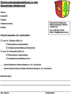 Sie sollten das Reisig auf der Internetseite der Gemeinde Heidenrod unter: Rathaus\OnlineServices\Schmuckreisigbestellung für den jeweiligen Termin vorbestellen. Vor Ort ist am Verkaufstag nur eine begrenzte Menge ohne Vorbestellung verfügbar.