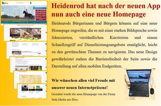 Die Gemeinde Heidenrod freut sich, ihre neue Homepage vorstellen zu können. Das bewährte Layout wurde dabei beibehalten, jedoch technisch und gestalterisch auf den neuesten Stand gebracht. Die Website präsentiert sich nun optisch ansprechend, übersichtlich und zeitgemäß - und ist selbstverständlich auf allen mobilen Endgeräten optimal darstellbar.
