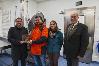 Der Verband handwerkliche Milchverarbeitung vergibt den Preis, übergeben von Herrn Geschäftsführer Marc Albrecht Seidel. Unter 130 deutschlandweiten Bewerbern erhielt der Ziegenhof Tönges die Preise "Bester Hofkäse (cum laude),