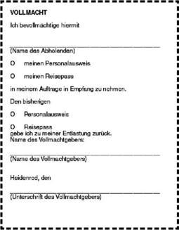 Sollte es Ihnen nicht möglich sein, den Personalausweis oder Reisepass selbst abzuholen, stellen Sie dem Abholenden bitte untenstehende Vollmacht aus.