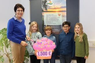 Maya, Diego, Konrad und Isabella (von rechts) überreichen Dorothea Ahlers (links) den großen Spendenmuffin.