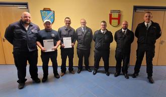 von links nach rechts: Stephan Engel (Feuerwehrmann), Marcel Weber (Feuerwehrmann Anwärter) Kyron Flament (Oberfeuerwehrmann), Jan Kraus (BGM), Dominik Gauf (Stellv. Wehrführer), Marc Conradi (Wehr-führer), Sascha Kopton (GBI)