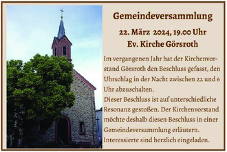 | 19.00 Uhr | Gemeindeversammlung in der Ev. Kirche Görsroth |