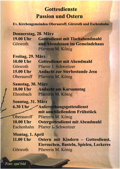| 10.00 Uhr | Gottesdienst in der Ev. Kirche Eschenhahn |