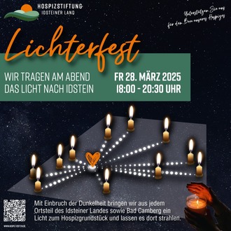 Am 28.3.2025 möchten wir eine besondere Aktion zugunsten des Hospizneubau ins Leben rufen: An diesem Abend wollen wir gemeinsam symbolisch um 18:00 Uhr das Licht nach Idstein tragen - auf das Grundstück des neuen Hospizes in der Ludwigstraße.