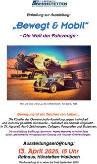 Mit welchen dieser Fort-Bewegungsmitteln sich die Ausstellenden künstlerisch beschäftigten, werden Sie in der neuen Ausstellung der Gemeinde betrachten können! Darauf kann man gespannt sein! Sind es tatsächlich die Autos oder gar die Raumfahrzeuge?