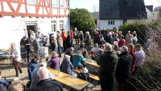 Am Sonntag, den 16. März 2025 um 15:00 Uhr war es endlich soweit. Das Heimatmuseum Hünstetten öffnete offiziell seine Pforten! Schon um 14:30 Uhr trudelten die ersten Gäste ein. Da hieß es noch mal Gas geben und die restlichen Kuchen und Torten für das große sehr abwechslungsreiche Kuchenbuffet aufschneiden. Während sich der Uhrzeiger der 15:00 Uhr Marke näherte kamen mehr und mehr Besucher und der Pfarrhof und die Wiese oberhalb füllten sich. Strahlender Sonnenschein in Bechtheims Dorfmitte machte das Ensemble aus Pfarrhaus, Pfarrscheune und evangelischer Kirche noch schöner.